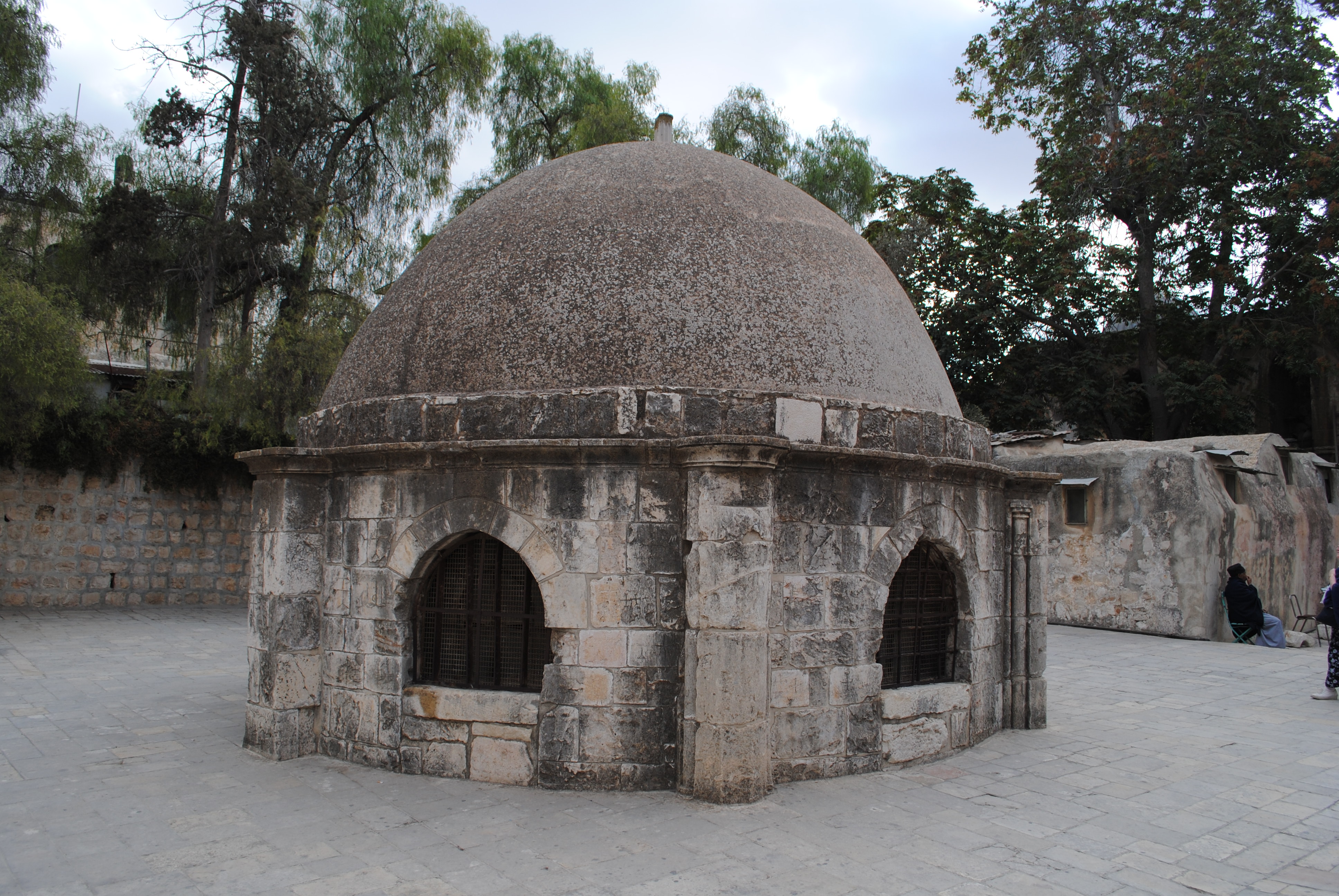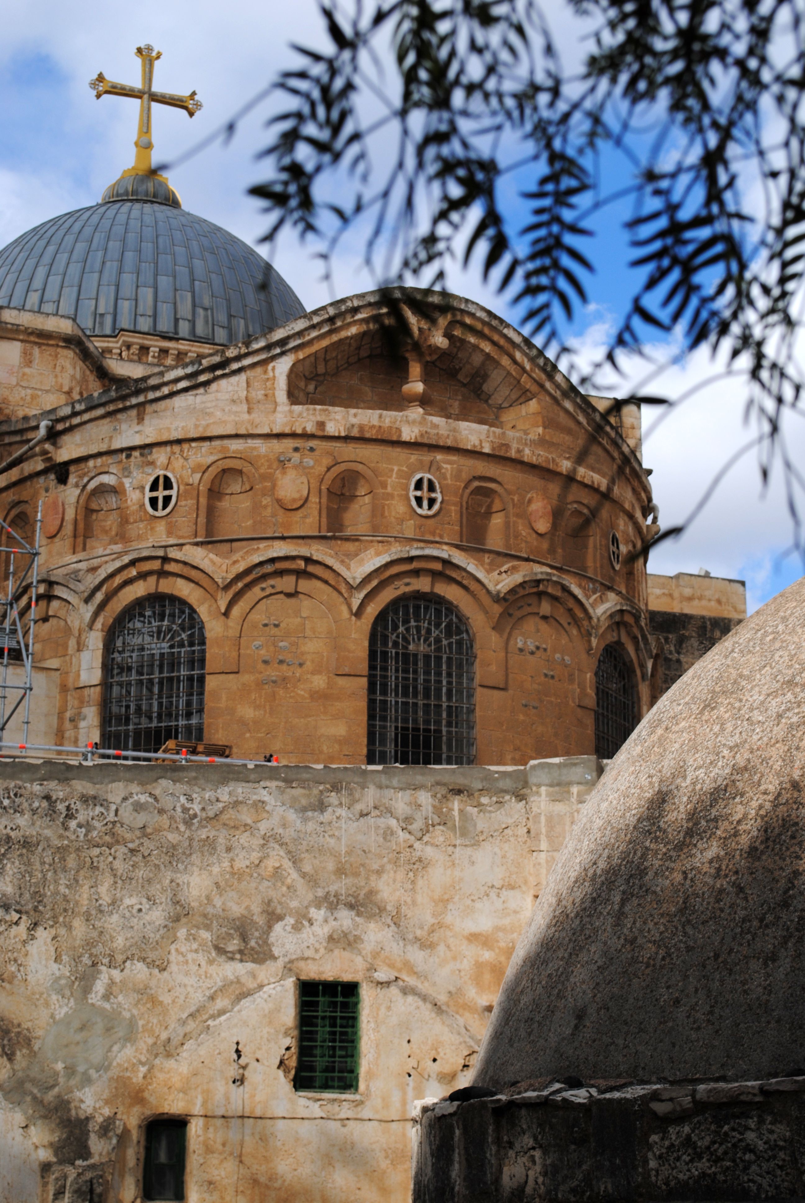 On quitte alors la chapelle par un escalier qui mène à la place où se trouve l’entrée du Saint Sépulcre, dont les clefs ont été confiées, de fort longue date, à deux familles musulmanes pour éviter que les querelles entre églises chrétiennes ne dégénèrent en conflit ouvert, voire violences physiques, ce qui est encore le cas, de temps en temps.