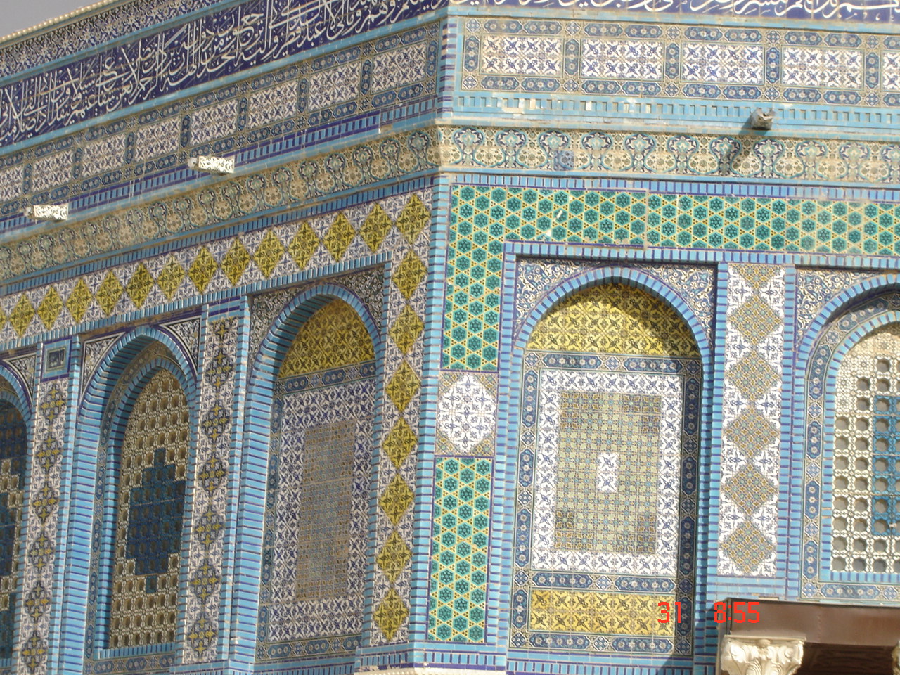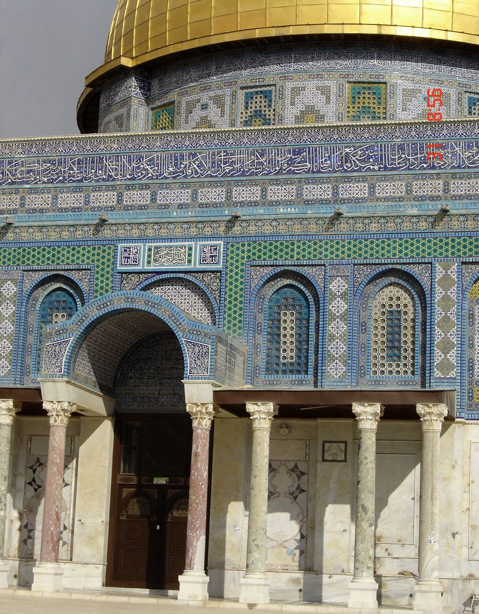 Il n’est pas dans notre intention au cours de cette visite de retracer toute l’histoire de Jérusalem. Nous rappelerons seulement que Jérusalem (Al-Qods) devint le troisième lieu saint de l’islam, avec la Mecque et Médine, lorsque les Arabes y arrivent en 637, après que la ville eut été occupée successsivement par les Romains et les Byzantins. Sur les ruines du temple laissées volontairement à l’abandon par les Chrétiens, le calife et compagnon de Mahomet, Omar Ibn Al-Khattab, décide de construire une mosquée terminée en 692 (an 72 de l’hégire), dite Dôme du Rocher ou encore mosquée d’Omar. Le Dôme du Rocher, qui ne possède pas de minaret, est construit à proximité de la première mosquée, appelée Al-Aqsa, construite avant 679, et donc la plus ancienne de l’esplanade.