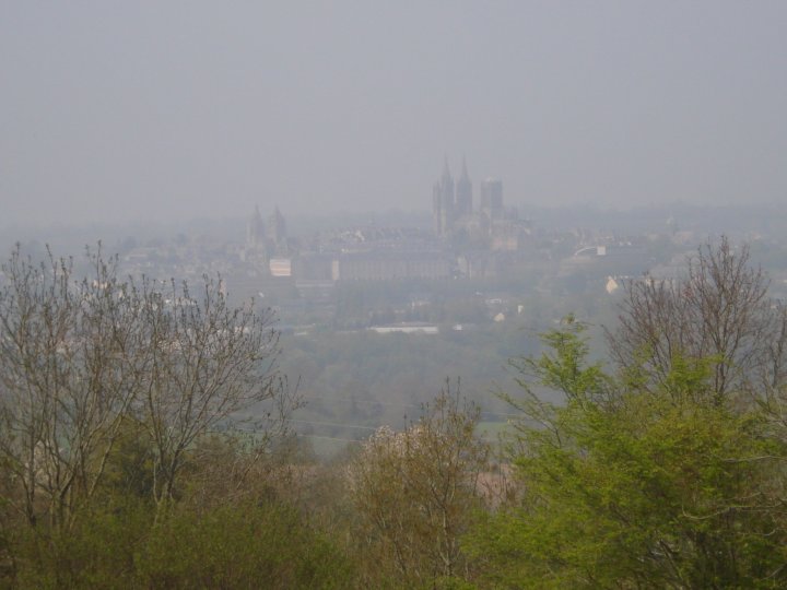 Vue sur Coutances de l‘enclos paroissial de Nicorps, dans une brume toute littéraire