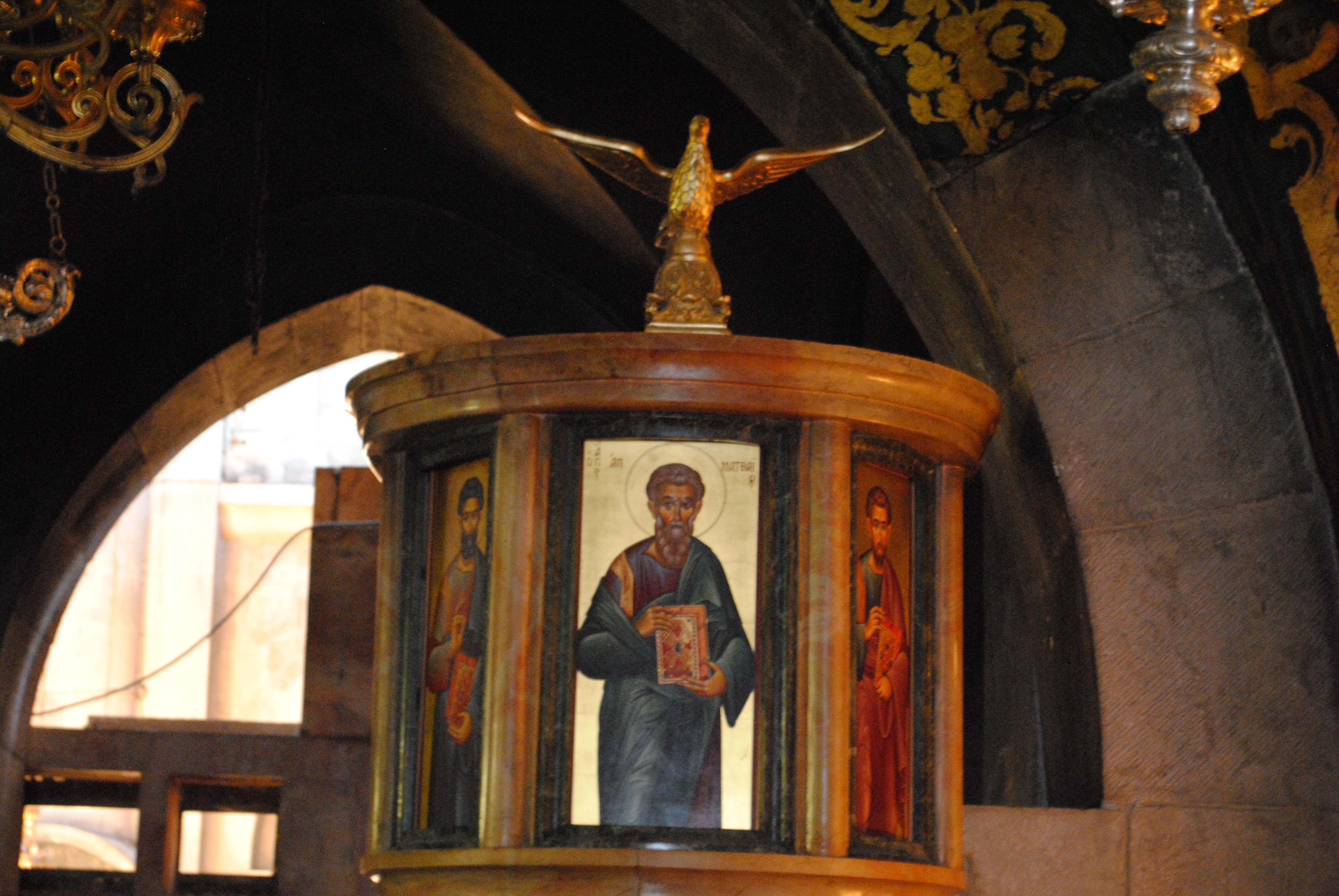 De nombreuses lampes de sanctuaire suspendues à huile ou à cire liquide éclairent les parties les plus ténébreuses de la basilique ; de même, l’aigle de saint Jean veille sur une chaire en bois, décorée de la réprésentation des quatre évangélistes.