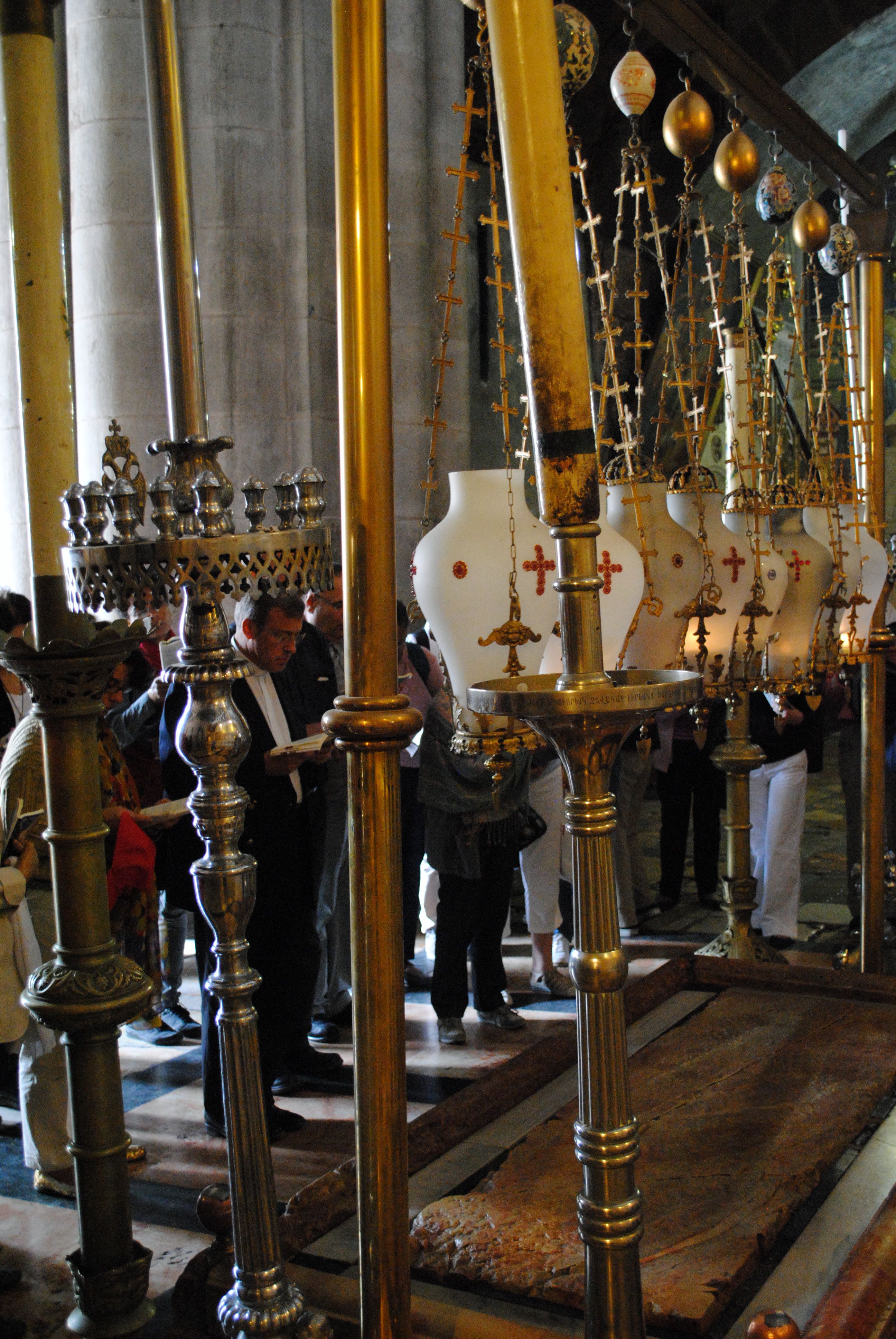 Le lieu est solennel, face à l’entrée principale de la basilique. La pierre recouverte d’une dalle de marbre qui n’a guère plus de deux siècles, est entourée de six porte-cierges de la hauteur d’un homme supportant des cierges d’un mètre de hauteur environ. Ils représentent ainsi, par deux, les trois communautés arménienne grecque et latine, en charge liturgique de cette pierre éclairée par huit lampes suspendues, dévolues en nombre différents aux différentes communautés religieuses se partageant le lieu Saint.