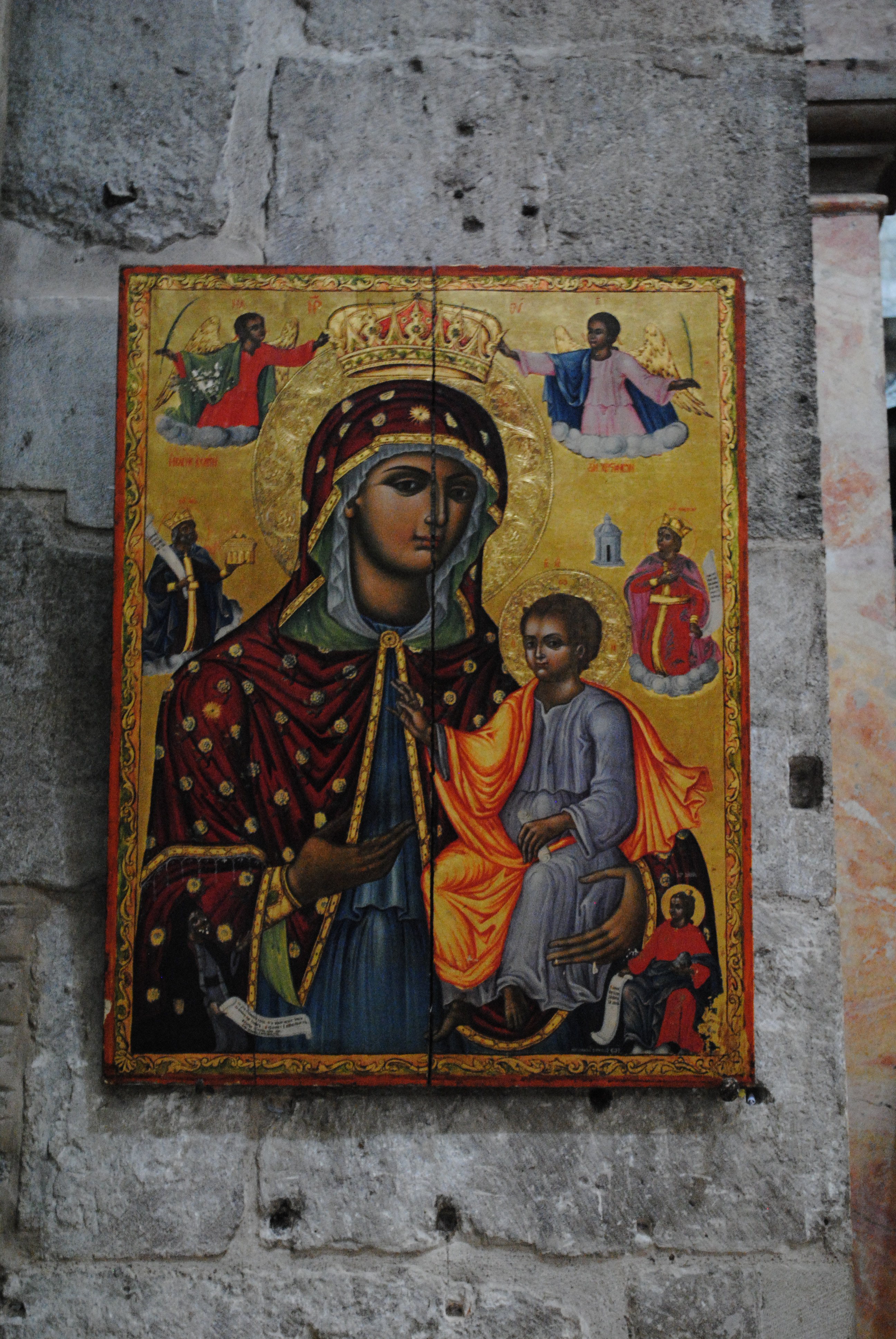 Le catholicon qui signifie en grec église d’un monastère, est construit sur l’ancien choeur des chanoines de la basilique des croisés. Son architecture est de forme quadrangulaire. La coupole du dôme, perchée à vingt mètres de haut, est décorée d’un Christ pantocrator qui est la représentation du Christ glorieux « tout-puissant », par opposition au Christ souffrant de la Passion. L’enfant Jésus est, sinon, la troisième représentation traditionnelle du Christ.