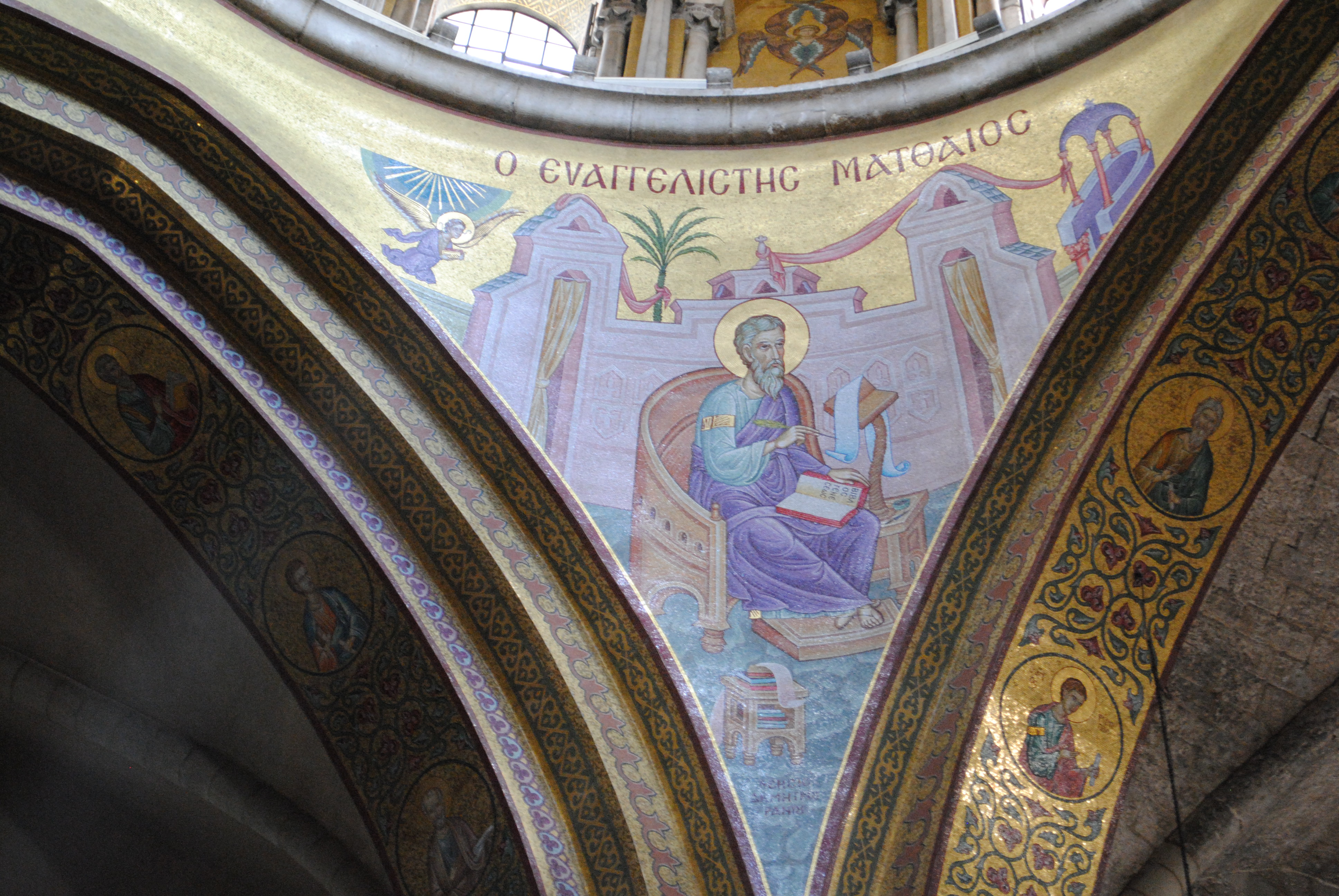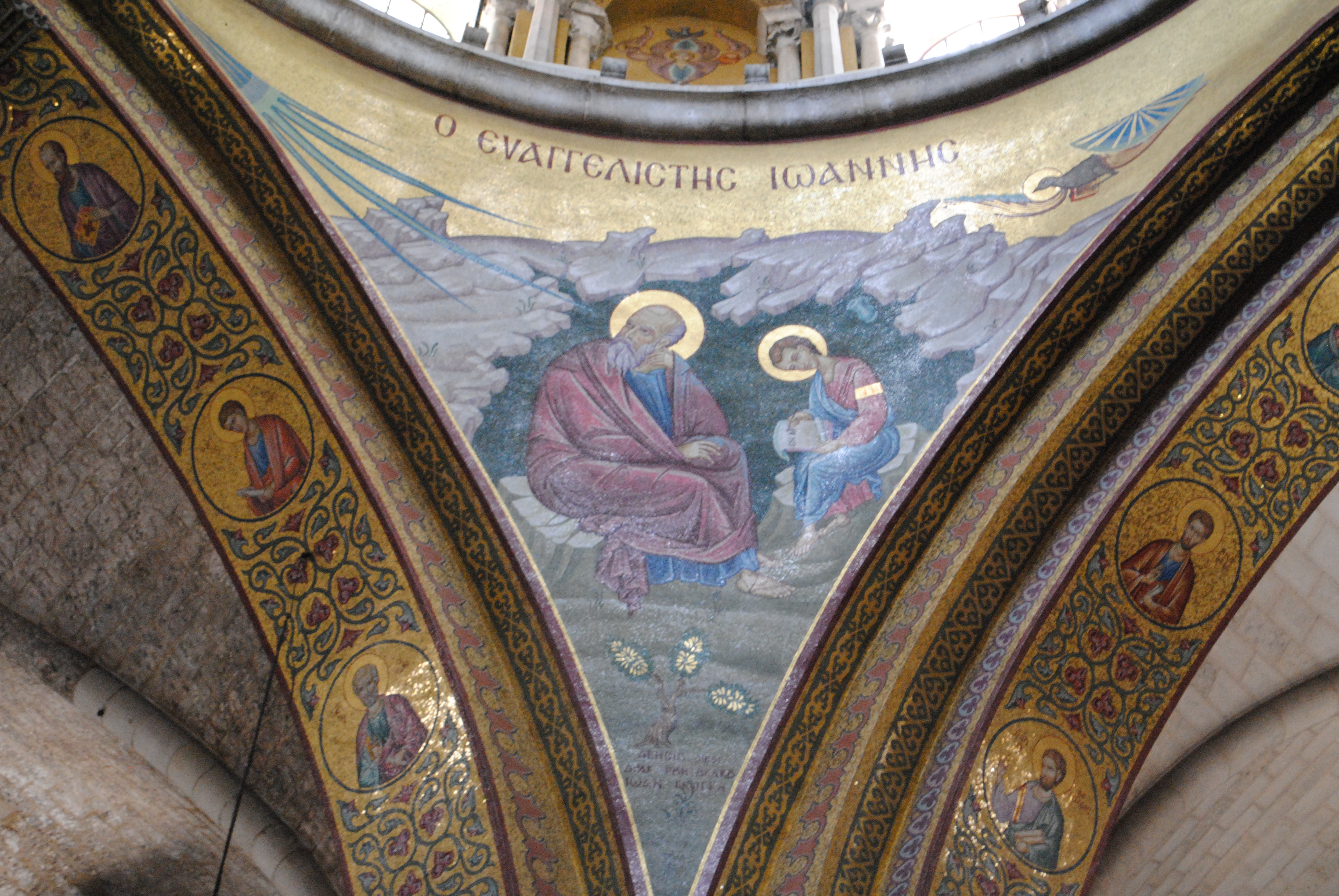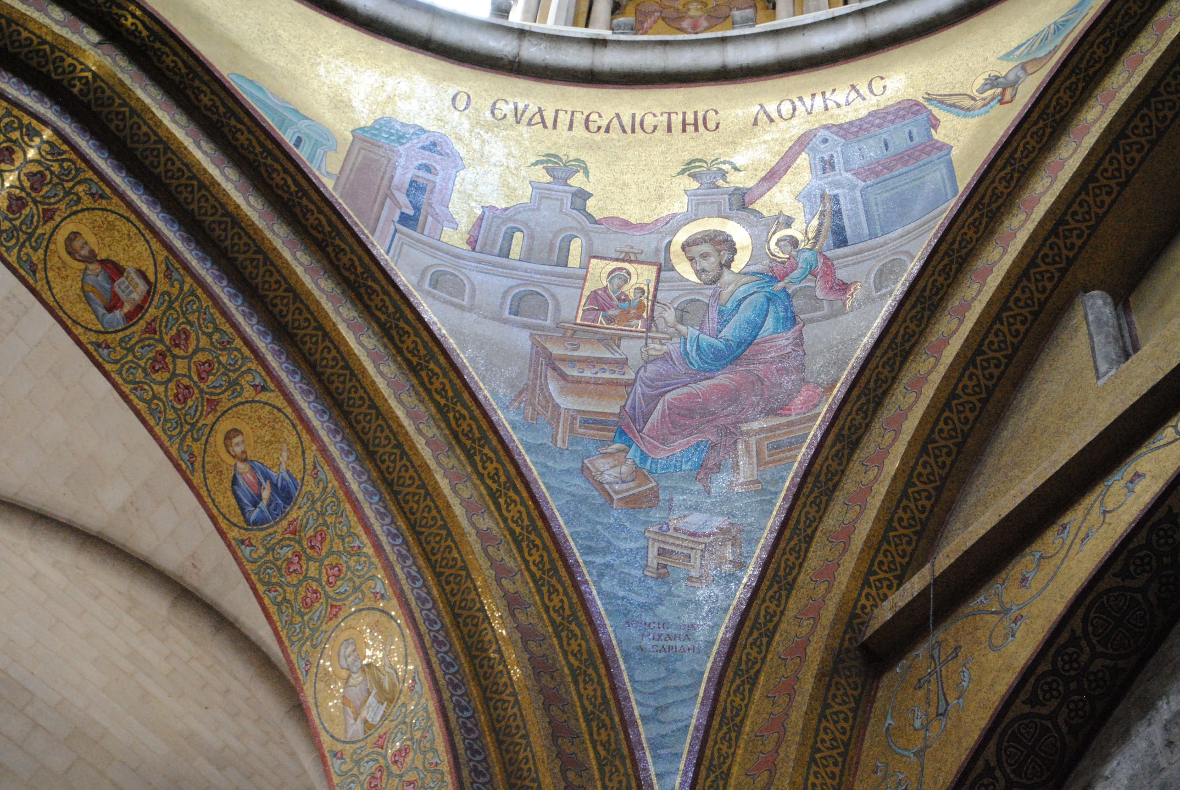 Les huit demi-cylindres de voûte du dôme catholicon forment quatre espaces triangulaires qu’on appelle pendentifs en architecture. Ces espaces sont ici recouverts de mosaïques récentes sur lesquelles sont représentés les quatre évangélistes, Luc, Jean, Marc et Matthieu.