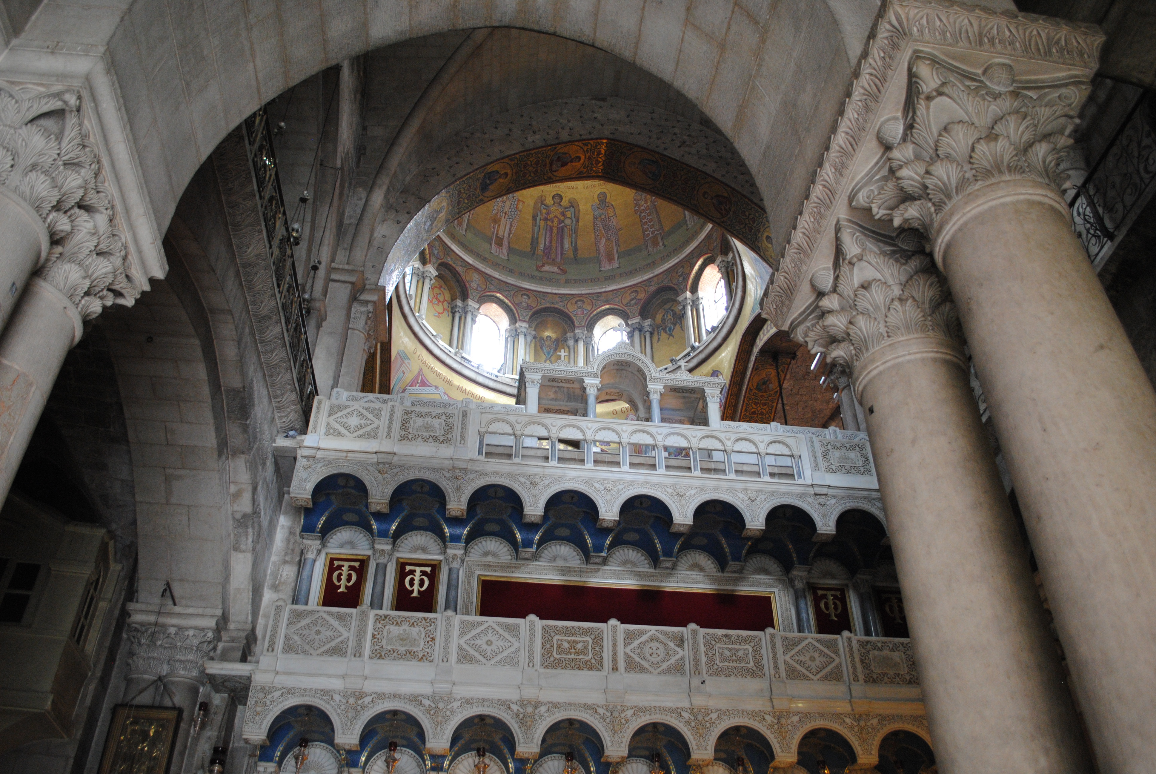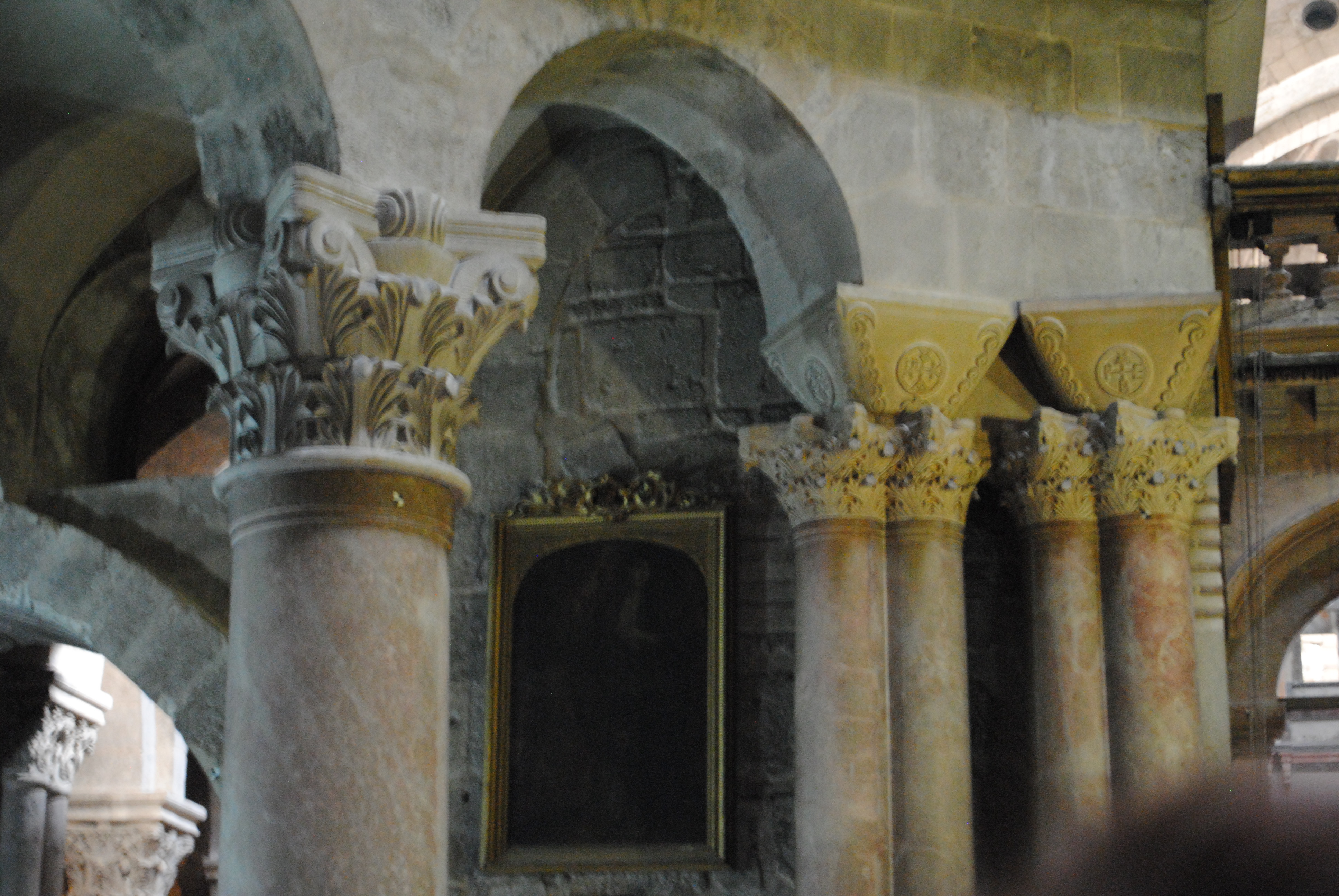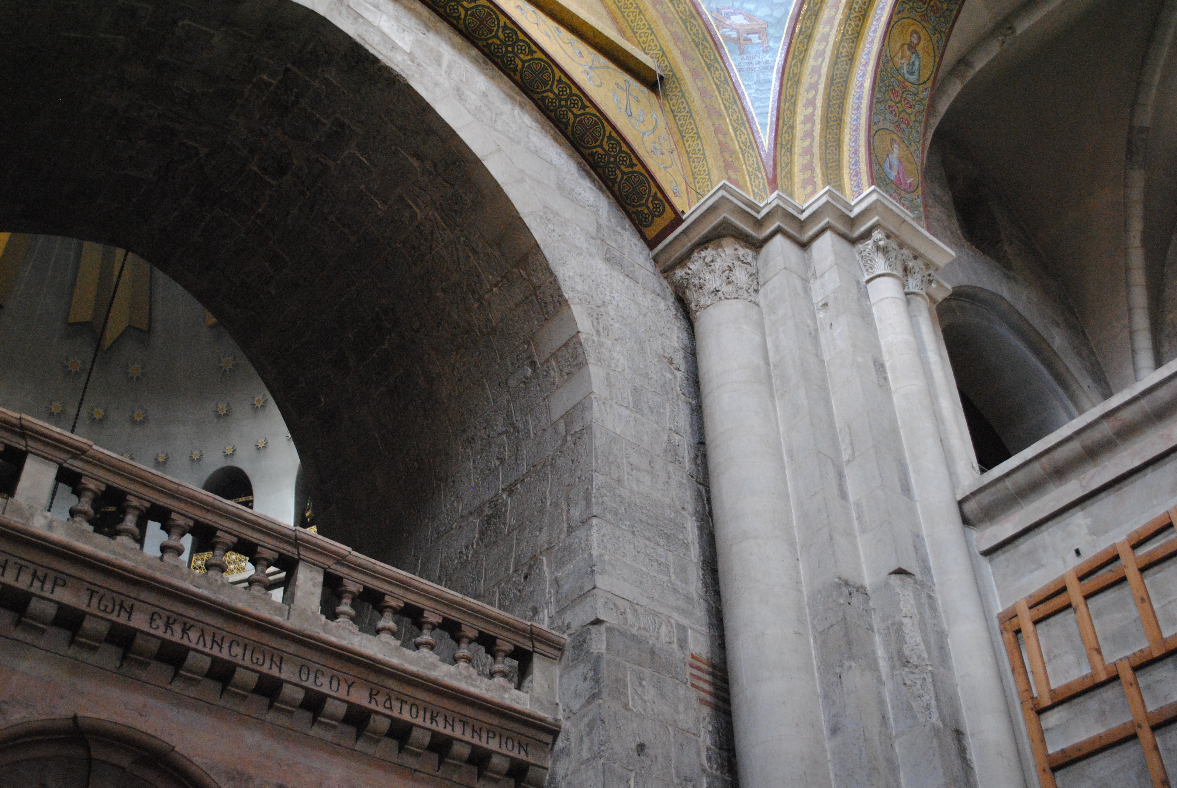 Au Saint-Sépulcre, partout la pierre suinte, s’impose, domine. Piliers, voûtes et ogives sont là pour nous rappeler deux mille ans d’histoire et nous faire voltiger de l’ombre à la lumière. Les destructions et effondrement successifs ont suscité reconstructions et réhabilitations qui ont conduit à multiplier les enchevêtrements architecturaux sur d’innombrables niveaux qui s’échelonnent des cryptes les plus profondes jusqu’aux toits et par-delà jusqu’au ciel. Et c’est miracle que tout tienne encore debout, malgré les ans. Heureusement, la basilique peut compter sur des piliers imperturbables qui veillent comme des templiers immortels sur le tombeau du Christ.