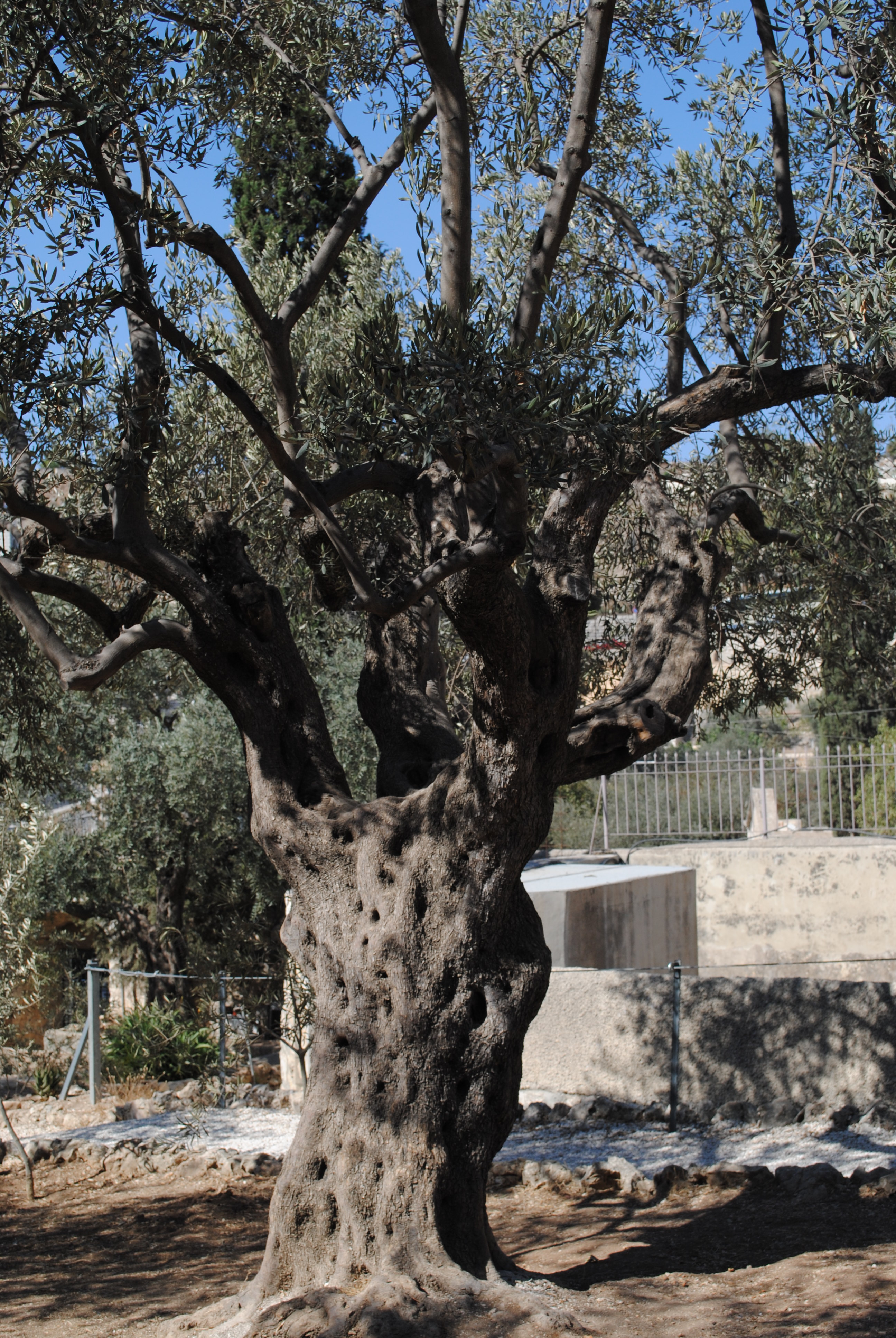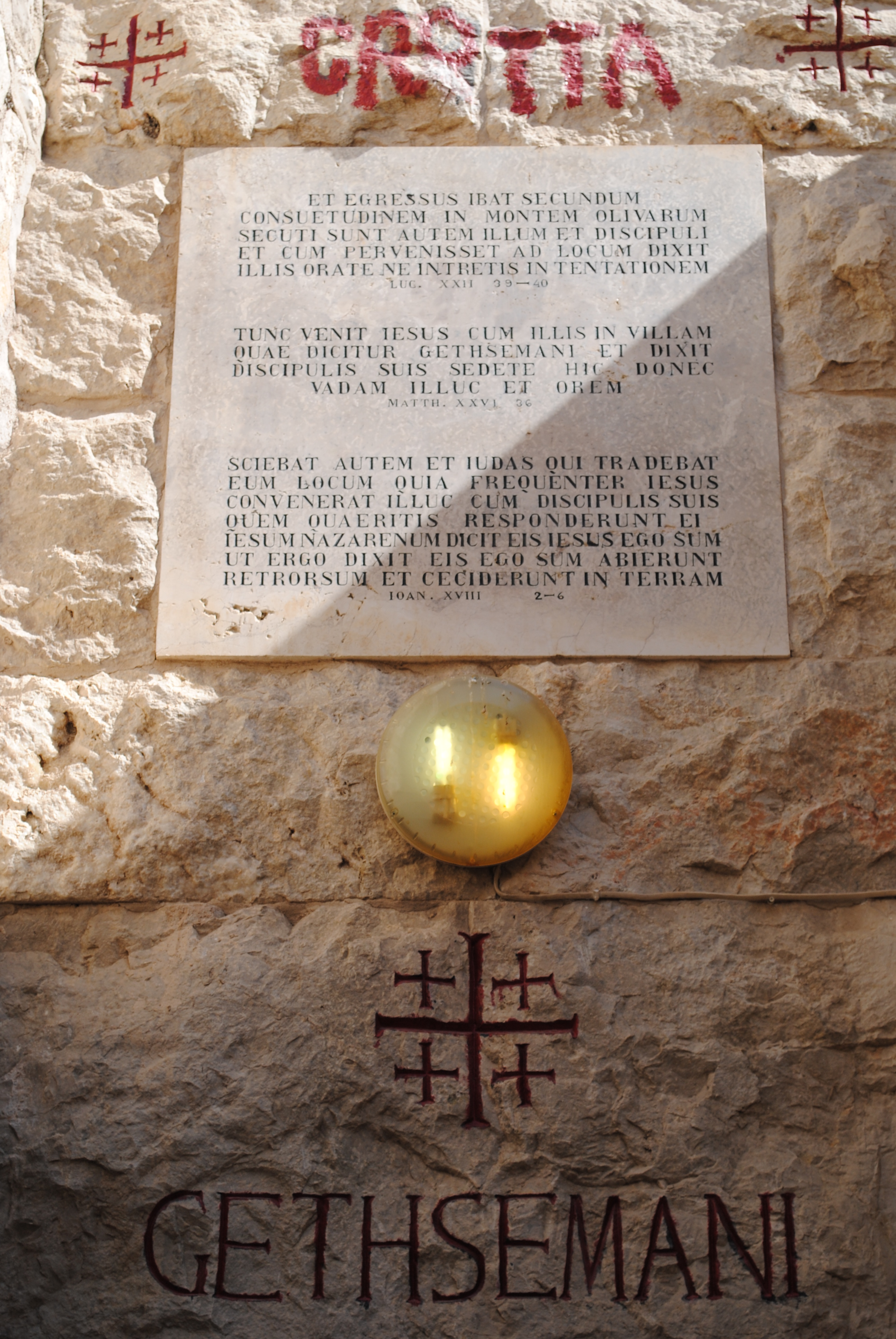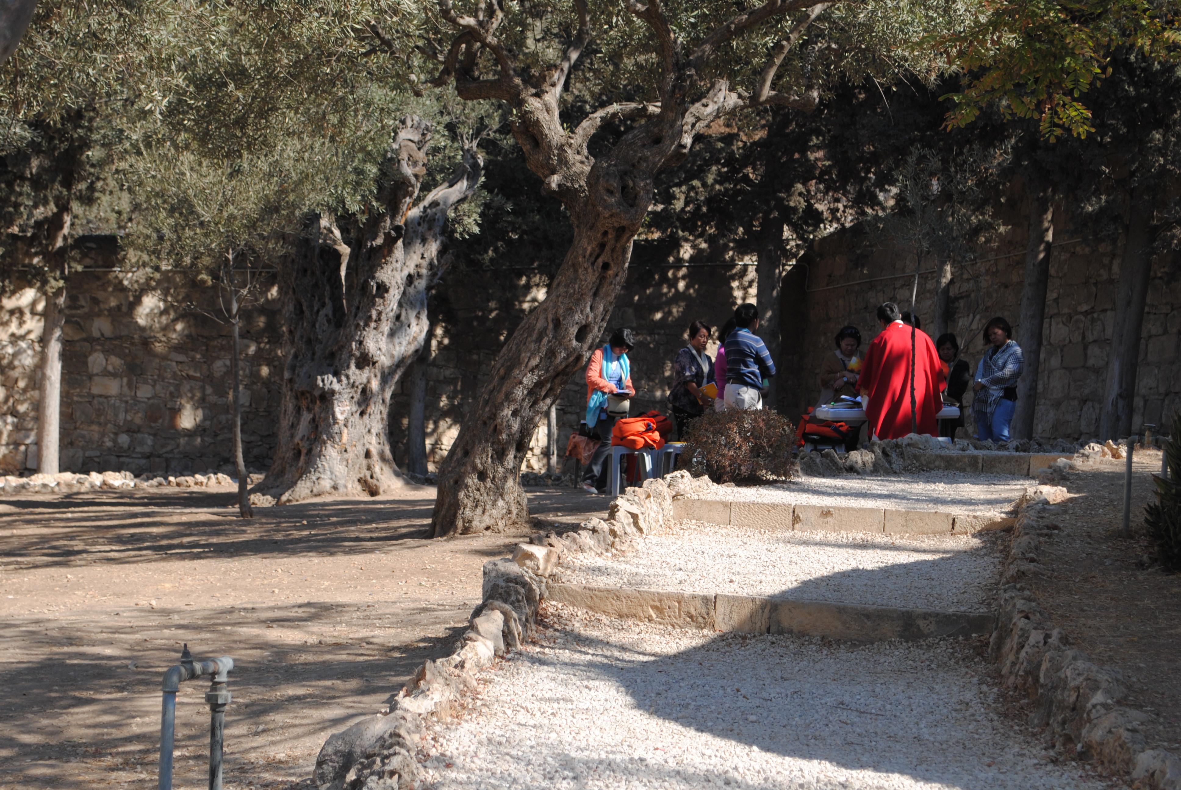 Après avoir quitté le carmel du Notre Père, longé le cimetière juif et visité le sanctuaire Dominus Flevit, descendant toujours le mont des Oliviers, tout proche de la vallée du Cédron, voici le jardin de Gethsémani, là où le Christ entra en agonie avant son arrestation par une bande à la tête de laquelle marchait le nommé Judas, l’un des Douze (Luc, 22,47). D’un côté du sentier se trouve la basilique de Toutes-Les-Nations, à laquelle on accède en traversant un jardin carré planté d’oliviers chargé de huit cents ans d’histoire ; et de l ‘autre côté du chemin, un jardin privatif tout aussi planté d’oliviers, réservé à la prière en petits groupes.