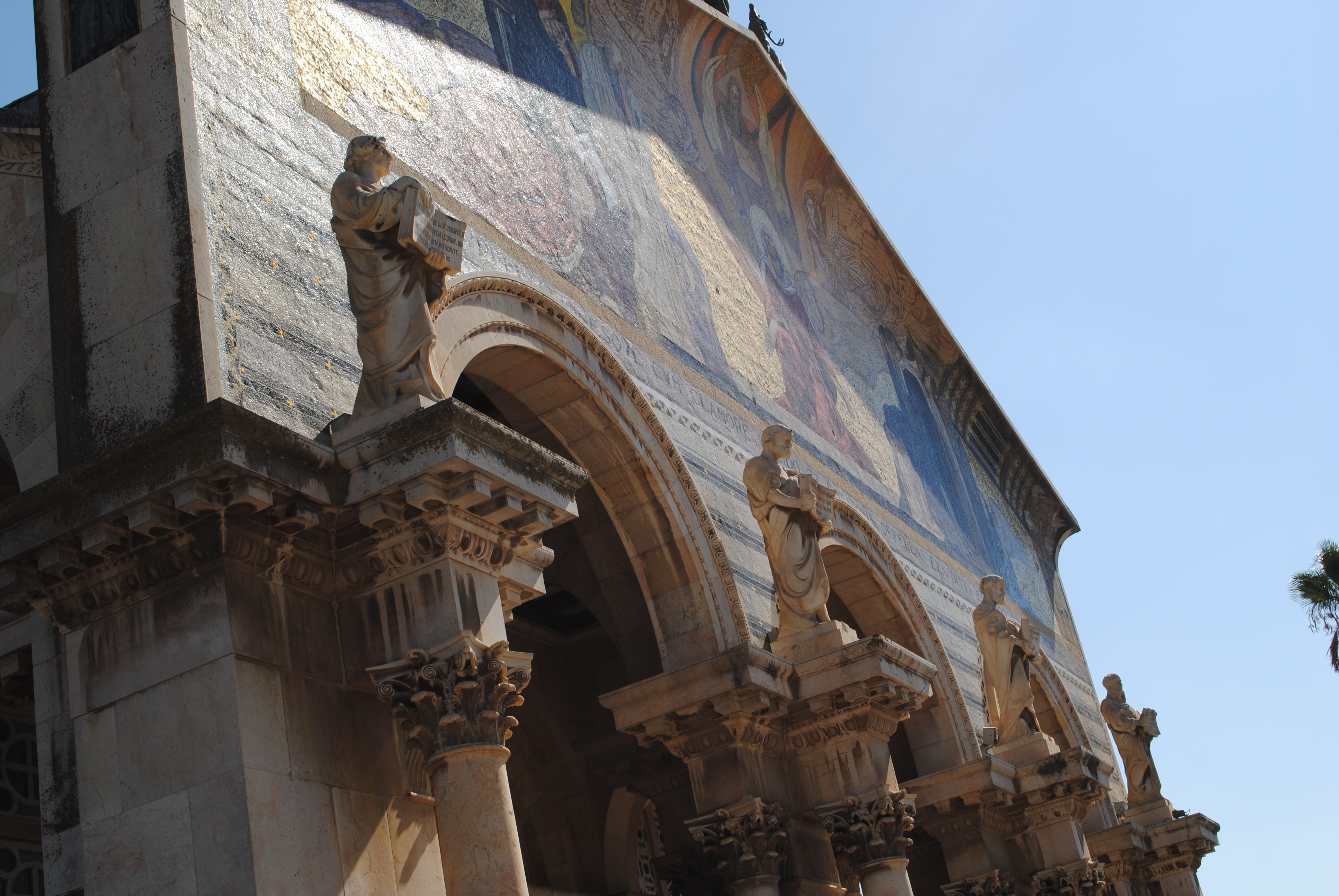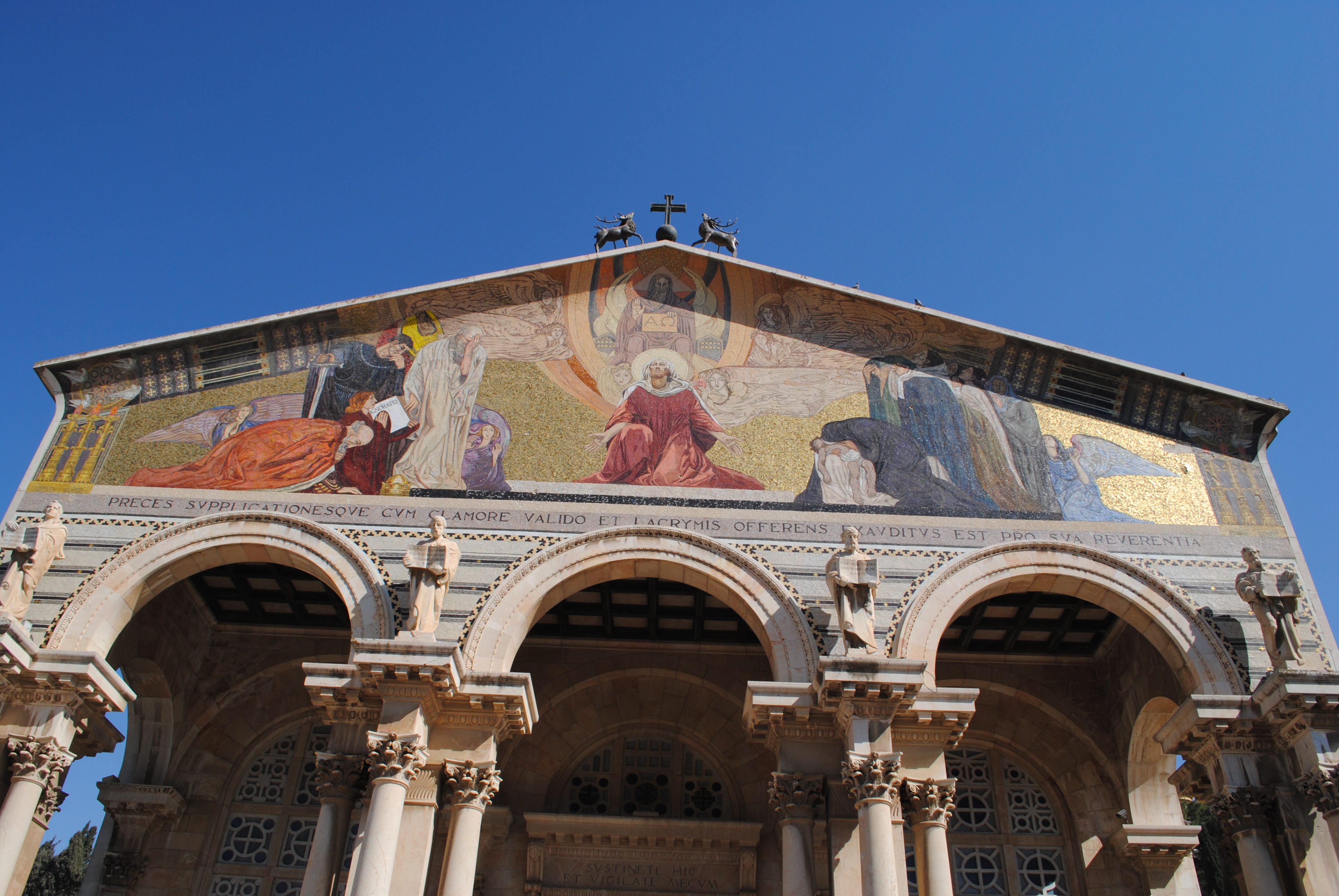 La basilique est récente, édifiée entre 1919 et 1924 sur un terrain appartenant aux Franciscains depuis le milieu du quatorzième siècle, et où se trouvaient les ruines d’une église croisée elle-même construite sur les vestiges d’une basilique byzantine datant du quatrième siècle, détruite par un tremblement de terre, Jérusalem étant un lieu régulièrement frappé par les séismes. Les statues des quatre évangélistes ornent le fronton de l’église.