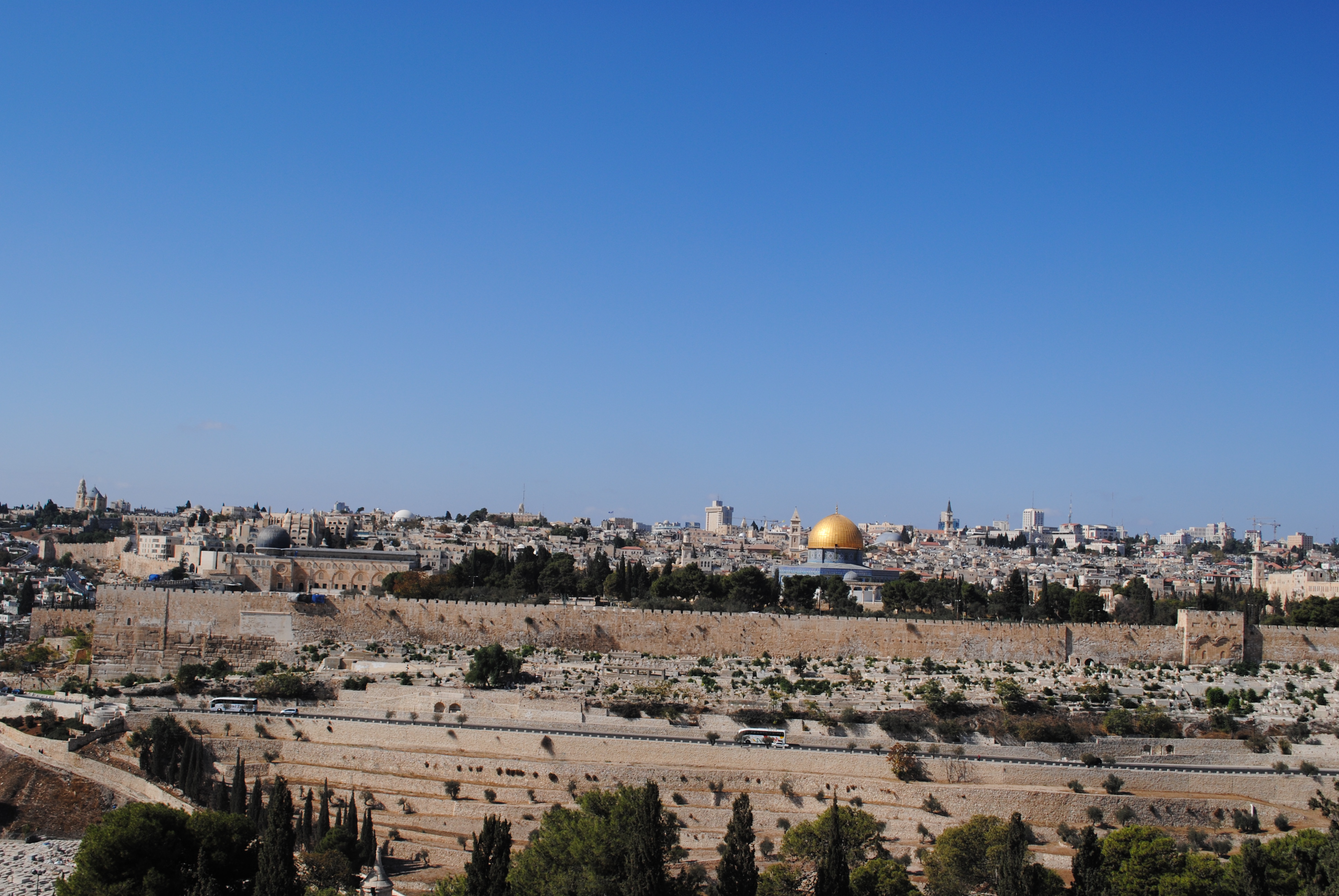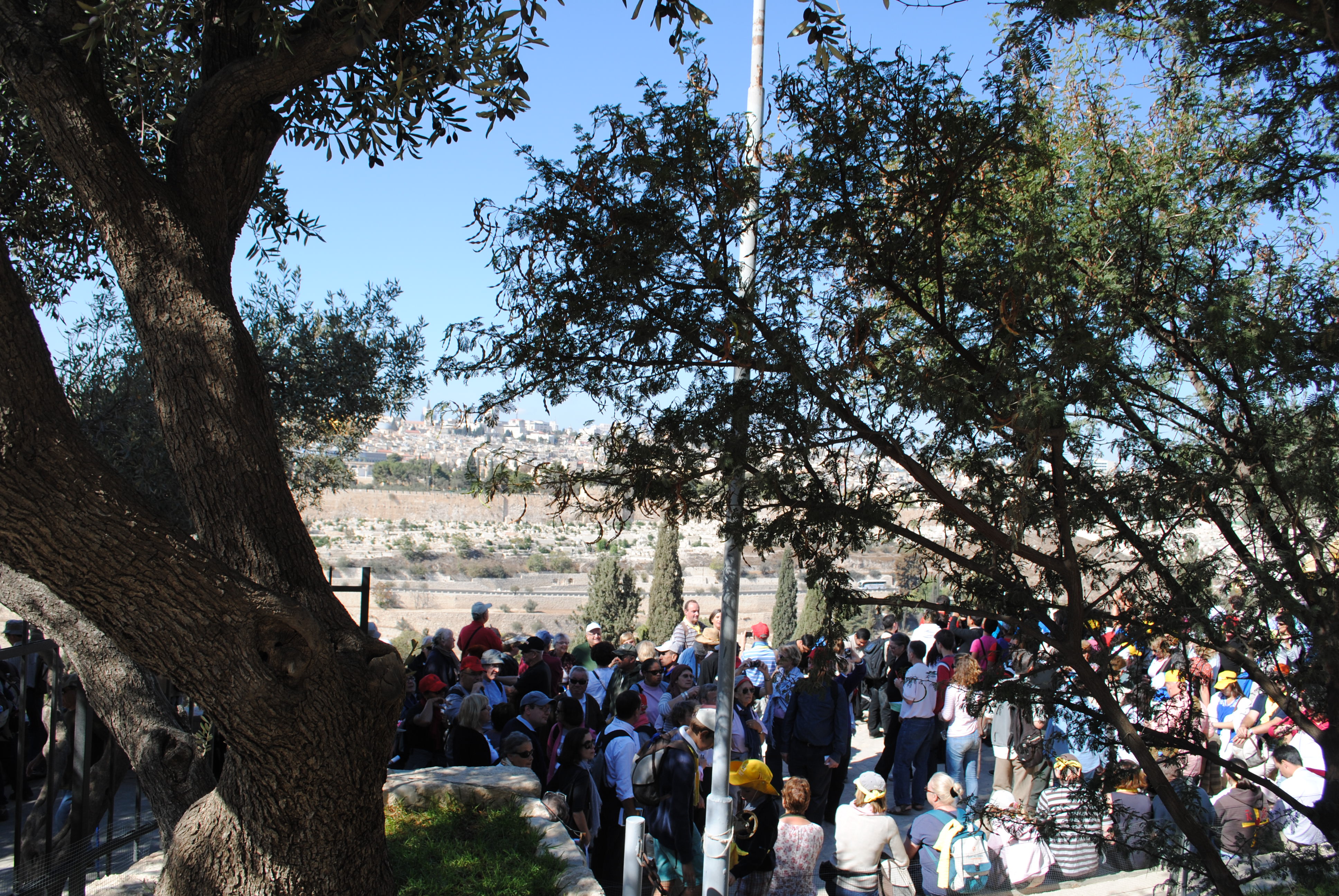 Après avoir quitté le carmel du Notre Père et longé le cimetière juif, descendant le mont des Oliviers, peu avant la vallée du Cédron, le panorama sur Jérusalem se rétrécit et la vue sur la vieille ville enserrée dans ses remparts, se précise, notamment sur l’esplanade des mosquées parfaitement visibles, le dôme doré du Rocher brillant tout particulièrement dans le ciel bleu automnal.